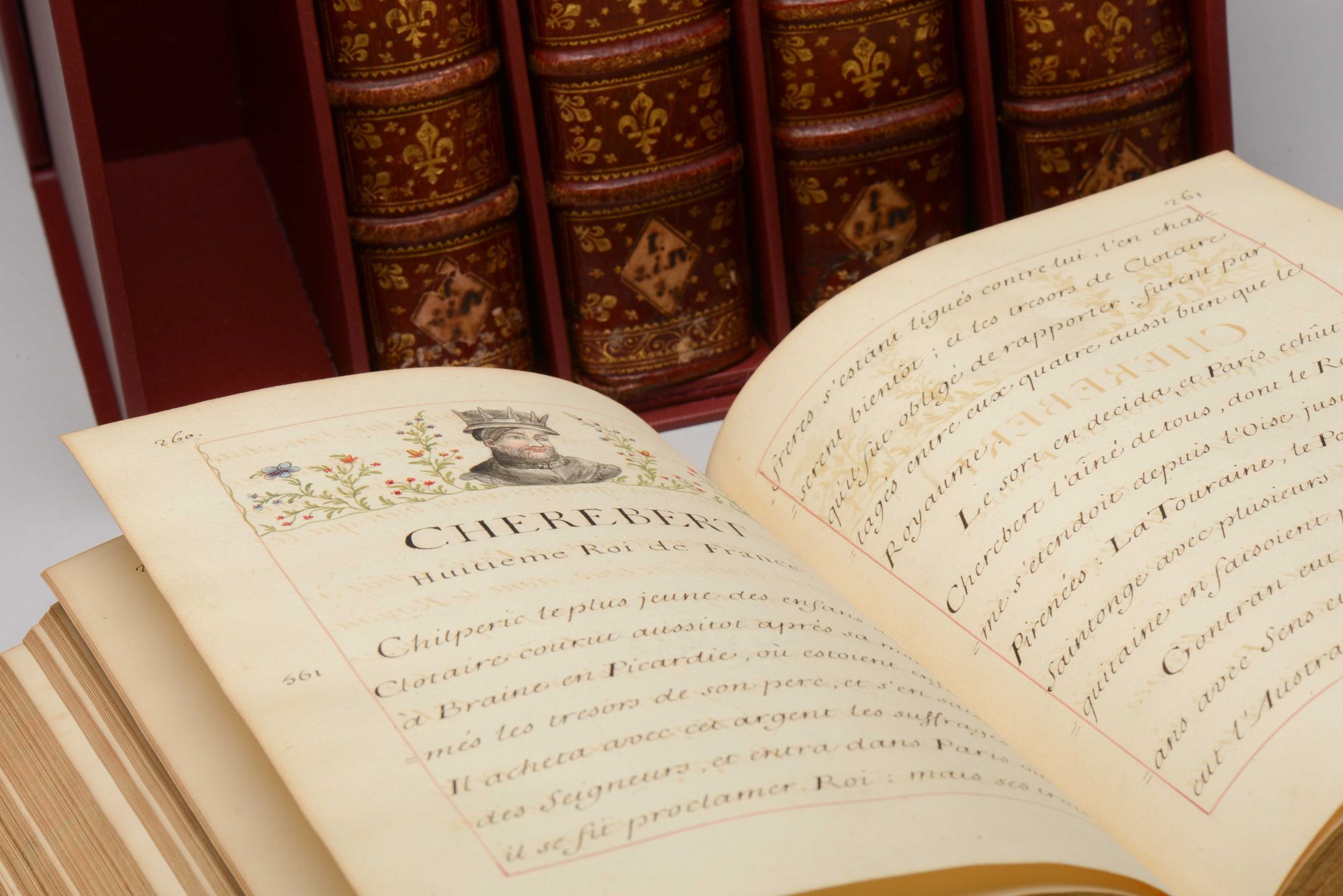 Intégrant dès son origine la bibliothèque du roi, l’Abrégé de l’histoire de France suit Louis XV lors de son installation à Versailles à partir de 1722. Au moment de la nationalisation des biens patrimoniaux au cours des premières années de la Révolution, les ouvrages issus des collections royales sont répartis selon leur nature et leur intérêt entre les nouvelles bibliothèques publiques. Le caractère juvénile de l’Abrégé n’éveille pas la curiosité des bibliothécaires en charge de cette organisation. L’ouvrage est finalement oublié, délaissé avec des exemplaires en double que récupère, au début du XIXème siècle, le préfet de Seine-et-Oise pour orner dignement sa bibliothèque. Suite à la réquisition des résidences et bâtiments administratifs par les Prussiens en 1870, les Archives départementales récupèrent le manuscrit qui intègre la sous-série 1F comme de nombreuses pièces isolées exposées en préfecture. Son identification attendra plus d’un siècle. Elle sera initiée dans les années 1990 par Françoise Jenn, directrice des Archives des Yvelines et suite à son décès prématuré, poursuivie et approfondie par Chantal Grell, professeur, titulaire de la chaire d’histoire moderne à l’Université de Versailles-Saint-Quentin-en-Yvelines. Cette étude fera l’objet d’une importante publication en 2004 puis d’un colloque consacré à l’éducation des princes, l’année suivante.