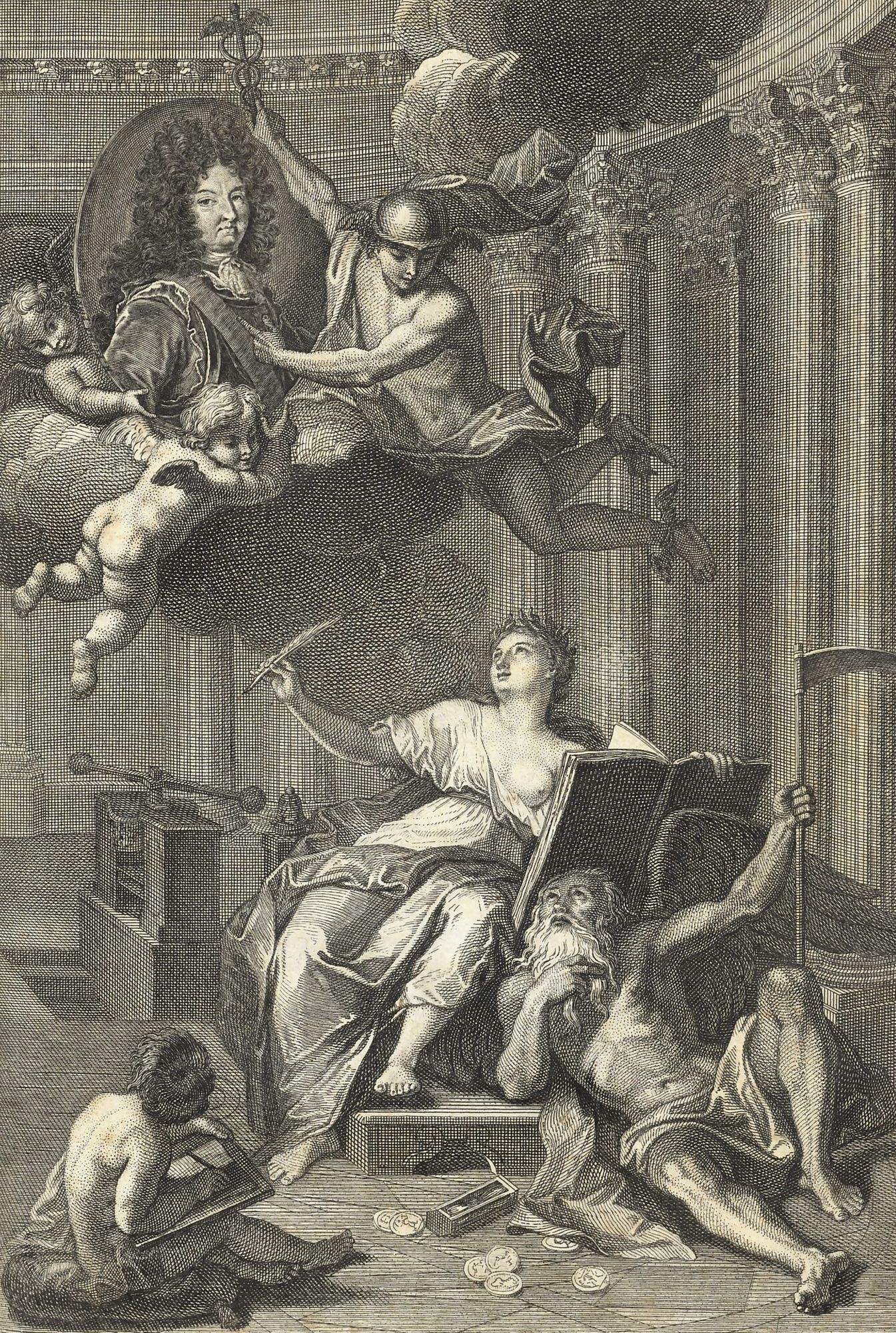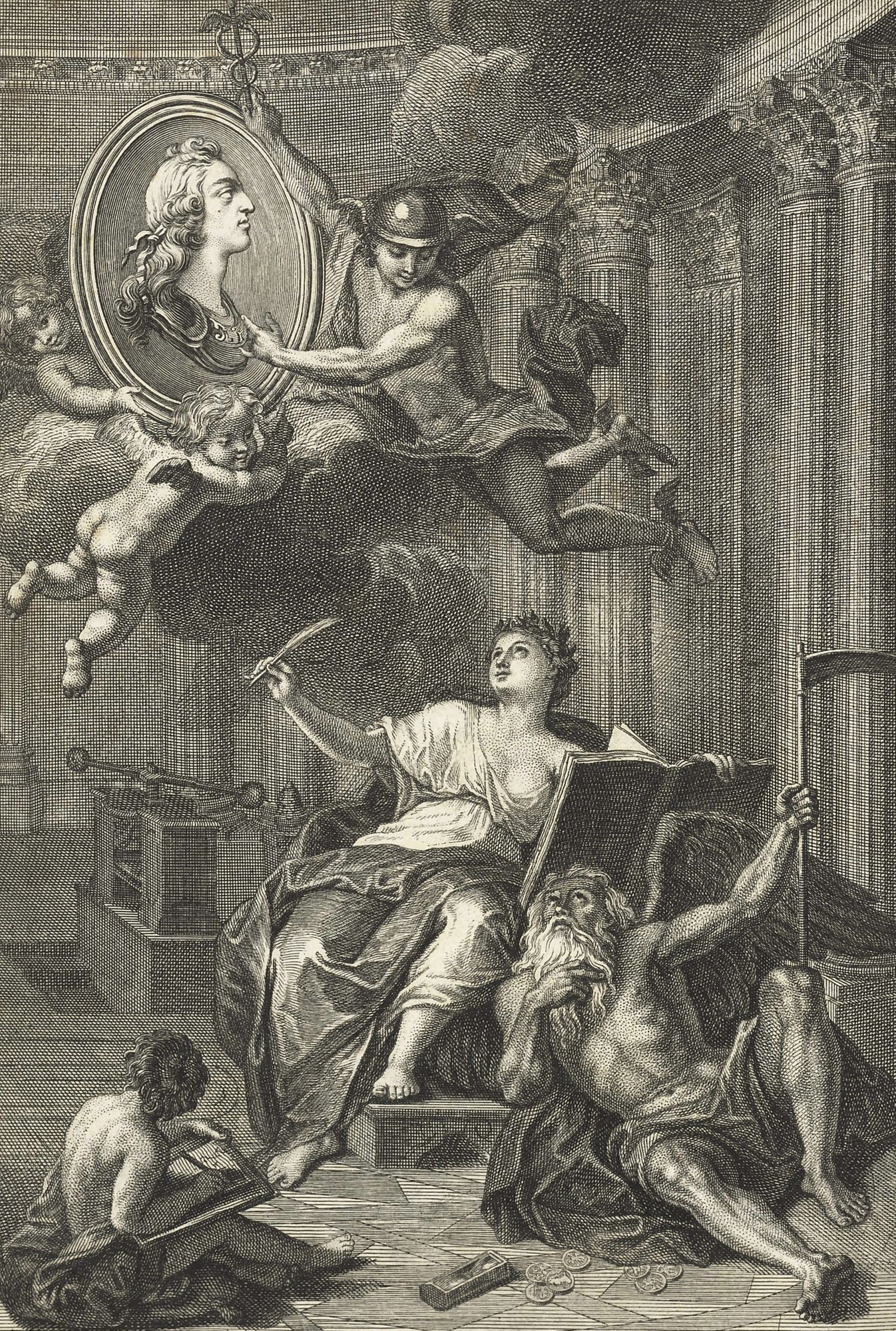 Frontispice de l'Histoire de l'Académie des Inscriptions et des Belles lettres (AD78 : FA-IN-4° 28 1 et 14).