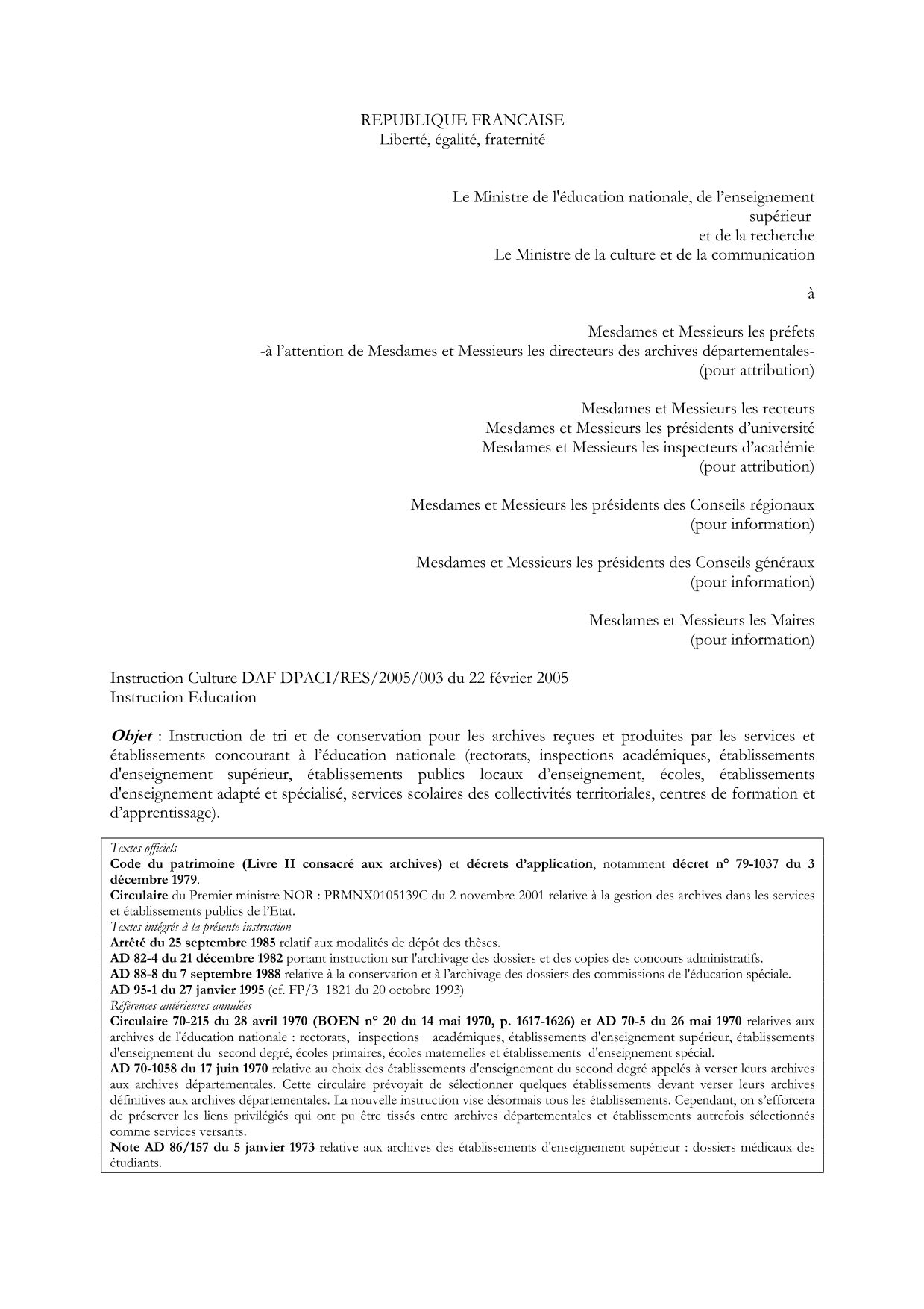 Chaque service dispose d'un référentiel de conservation (tableau de gestion des archives) qui détermine les délais de conservation et le sort réservé aux documents et aux données. Pour l'Education National, il s'agit de la circulaire circulaire de 2005 portant sur le tri et la conservation des archives de l’Education Nationale (DPACI/RES/2005/003).