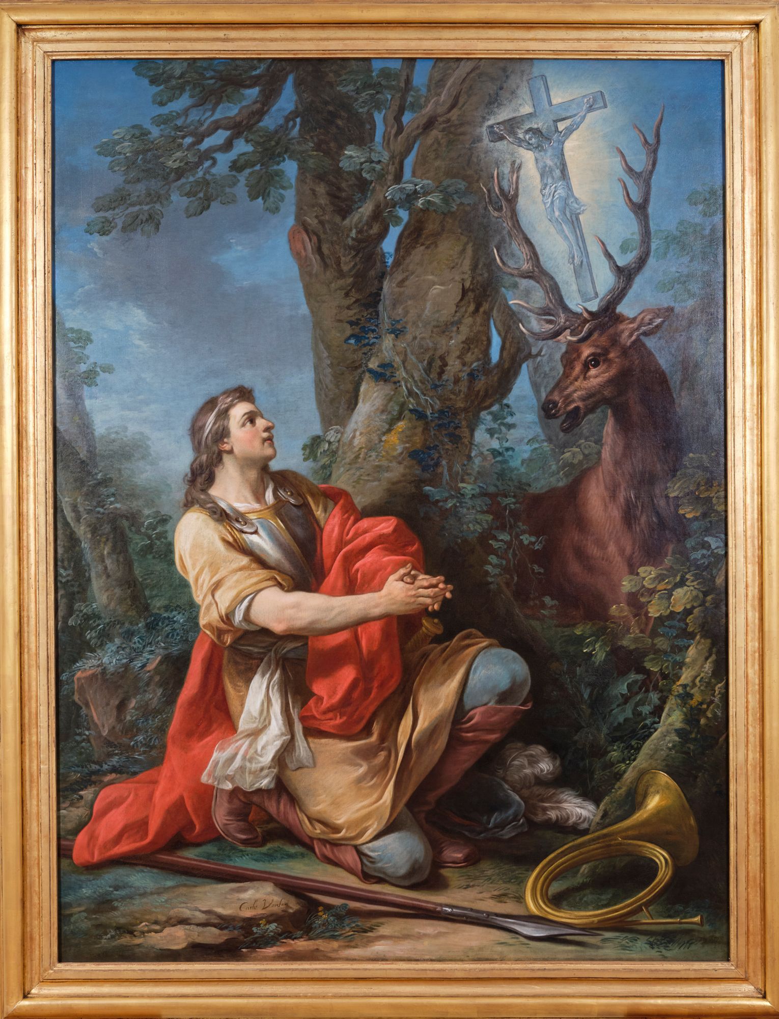 Peinture de belles dimensions (près de 3m de haut et 2m de large avec son cadre), la Conversion de saint Hubert est une œuvre qui attire le regard. Il s’agit d’une huile sur toile réalisée en 1758 par Carle van Loo (1705-1765). Peintre d’origine hollandaise, il mena en France une carrière couronnée de succès : membre de l’Académie royale de peinture et de sculpture, il devient gouverneur de l’Ecole des élèves protégés en 1754, puis peintre du roi en 1762 et directeur de l’Académie l’année suivante. Il exerce son talent dans des genres divers : peinture d’histoire, peinture religieuse, scènes mythologiques, scènes de genre, portraits.