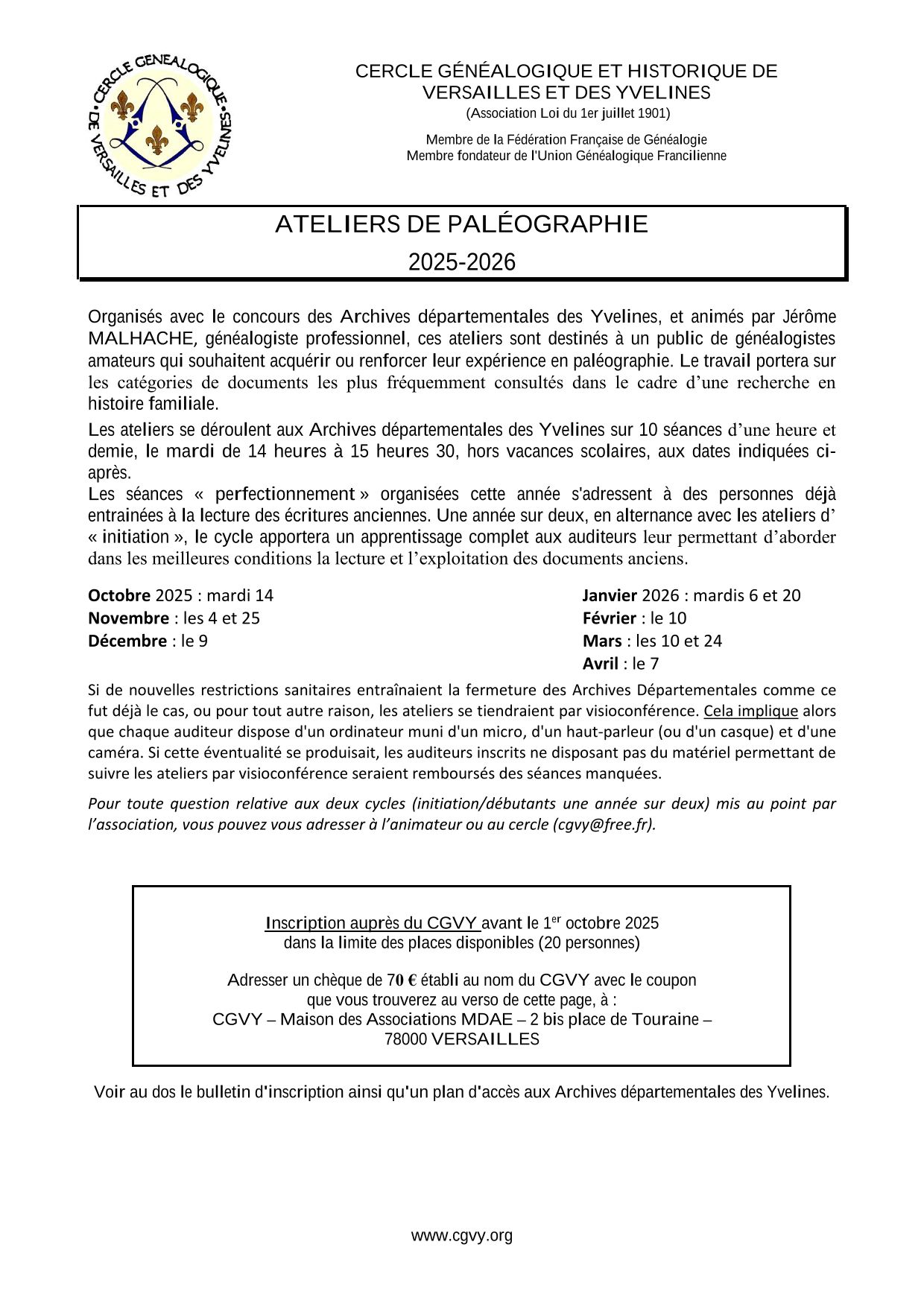 Les ateliers se déroulent aux Archives départementales des Yvelines sur 10 séances d’une heure et demie, le mardi de 14 heures à 15 heures 30, hors vacances scolaires, aux dates ci-après.