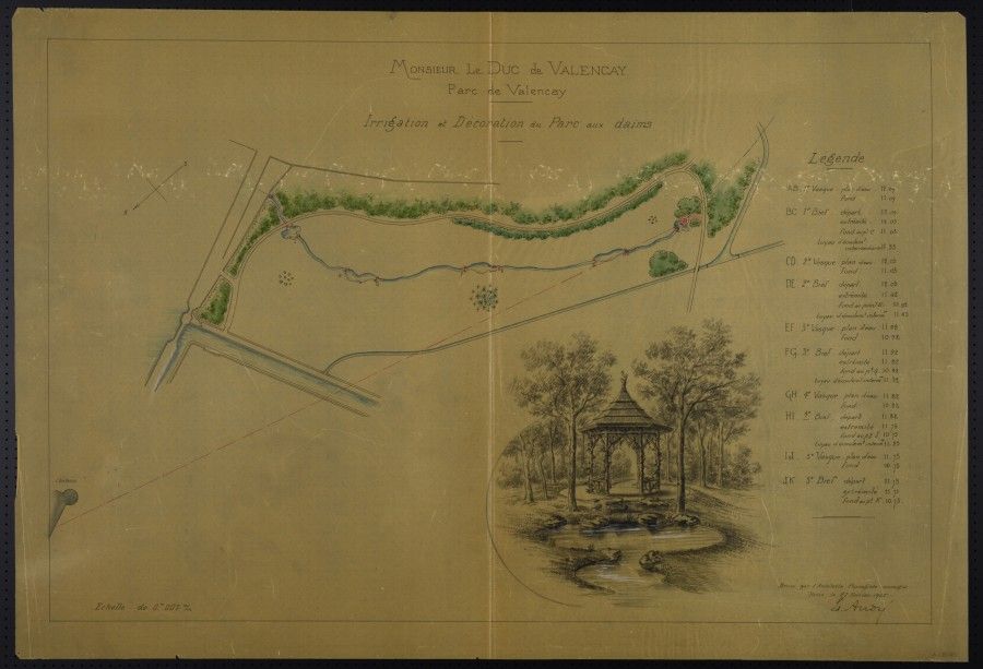 Parc de Valençay. Irrigation et décoration du parc aux Daims, 27 février 1905 : plan du parc et dessin du kiosque sous les arbres au bord du plan d'eau. Signé Ed. André.