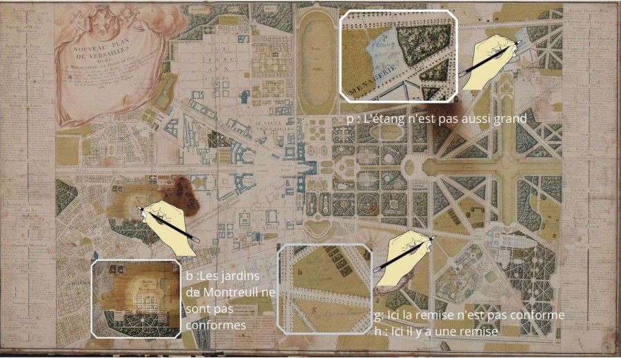 Ces mentions ont été récapitulées postérieurement à la Révolution, dans la partie basse du plan et témoignent autant du goût avéré du roi pour la cartographie que de sa connaissance précise de son domaine de Versailles.