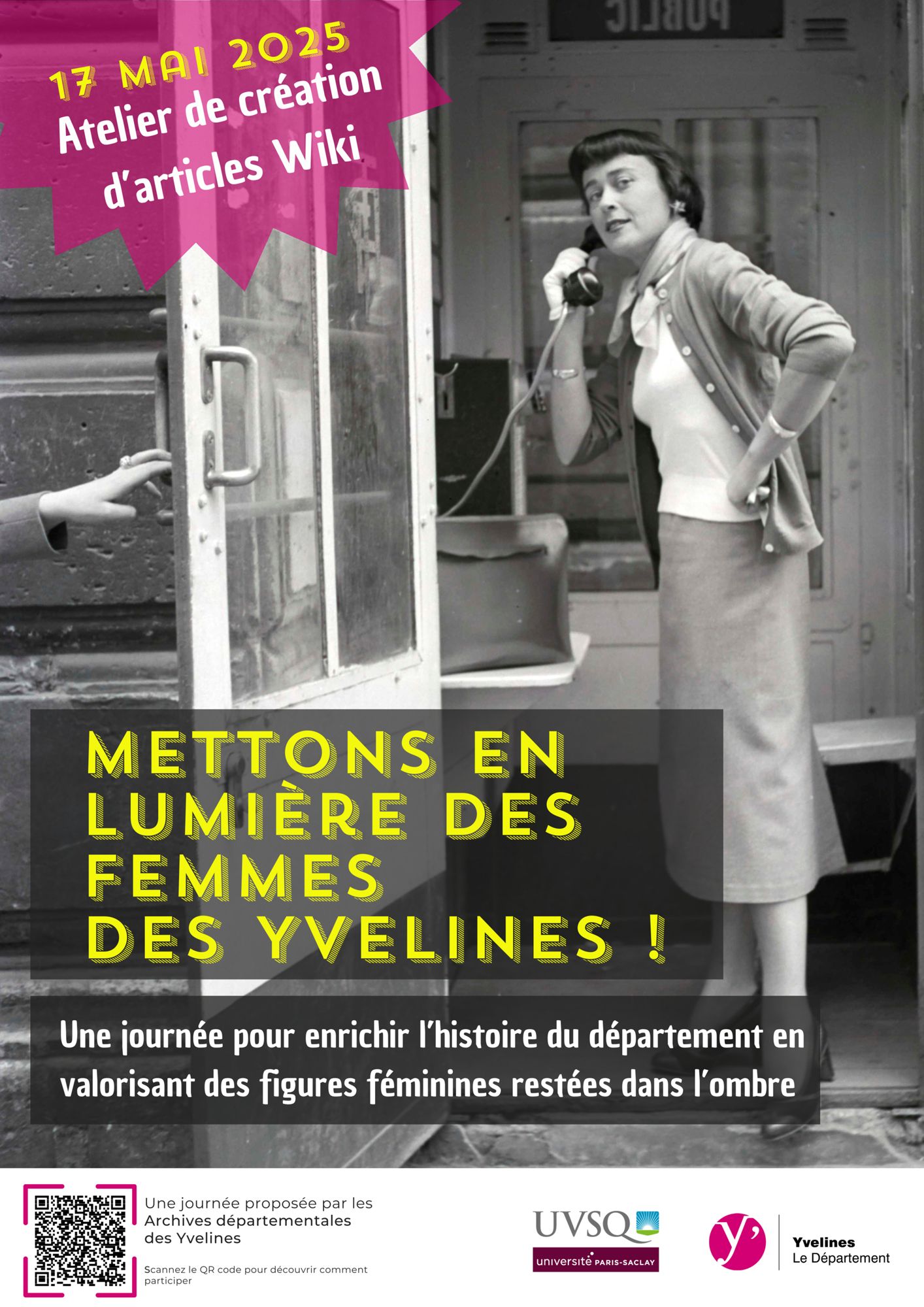 Pour ce wikithon, les Archives proposent de revaloriser des femmes yvelinoises restées dans l’ombre. Les Yvelines regorgent d’exemples inspirants ! Ce choix vise donc à révéler et célébrer des femmes remarquables dans leur domaine, qu’elles soient pionnières, artistes, sportives, entrepreneuses, médecins ou encore militantes. À travers leurs actions, elles ont façonné le territoire et participé activement à son histoire, son développement culturel, social et économique. Créer de la connaissance sur l’histoire des femmes et compléter ainsi l’histoire du département, tels sont les objectifs de ce premier wikithon.