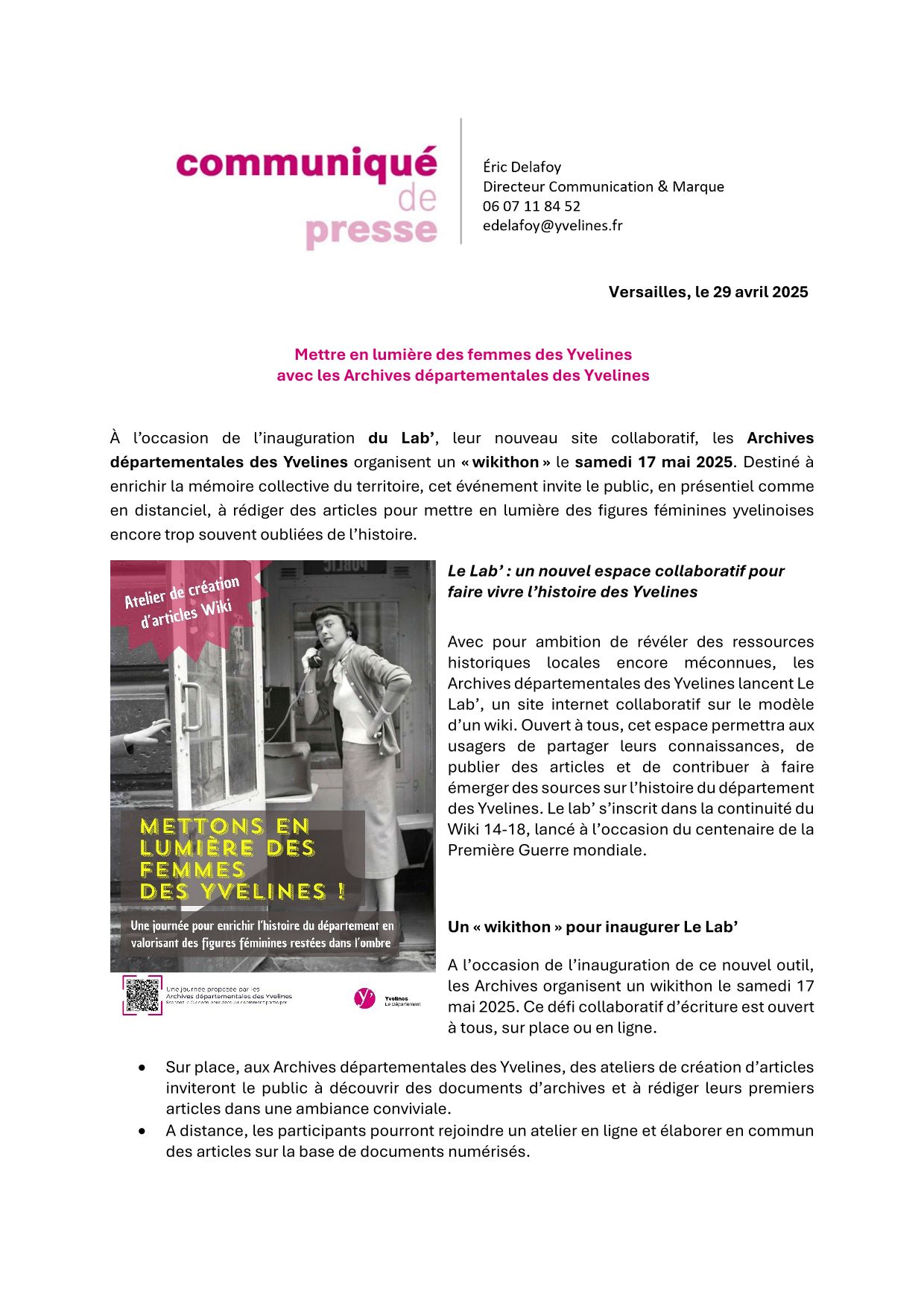 Le samedi 17 mai 2025, à l’occasion de l’inauguration du Lab’, les Archives invitent le public à participer à un wikithon, un défi collaboratif d’écriture d’articles visant à enrichir ce nouvel outil. Cet événement se tiendra à la fois sur place et en distanciel. Sur place, aux Archives départementales des Yvelines, des ateliers de création d’articles seront proposés au public, amené à découvrir des documents d’archives et à publier des articles dans un cadre convivial. En distanciel, le public pourra se connecter à un atelier en ligne et élaborer en commun des articles sur la base de documents numérisés.