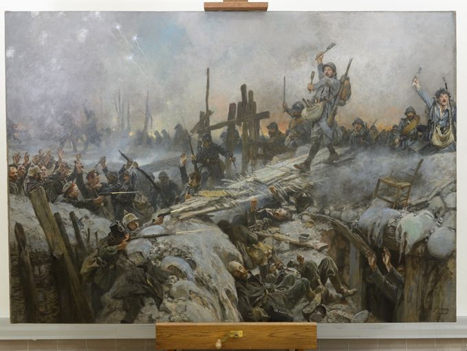 La restauration du tableau de Courgent : La Bataille du 25 septembre 1915 (Champagne), prise de la tranchée allemande devant Perthes (9 heures 30 du matin), peint par François Flameng (1856-1923).