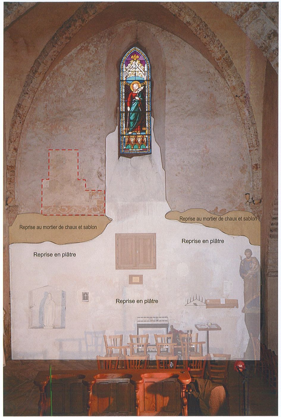 Lors de l’étude, c’est près de 18 zones de sondages qui ont été choisies pour mieux appréhender la chronologie des décors, en lien avec les phases de construction de l’église. Ces « fenêtres », pratiquées dans la peinture, ont ainsi permis de déterminer la présence d’au moins 5 campagnes de décoration :
