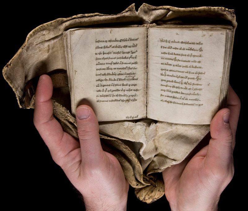 Dans la statue de Villette, le livre est en partie brisé, mais on distingue encore, sur les côtés, les pans souples d’une reliure en cuir et une torsade qui permettait de le porter. Il s’agit d’une version plus simple. Etonnamment, aucune bibliothèque française ne semble conserver ce type de reliure. Pour en trouver un exemple c’est dans les collections danoises ou allemandes qu’il faut rechercher cet objet ordinaire dont un inventaire international a été lancé depuis quelques années.