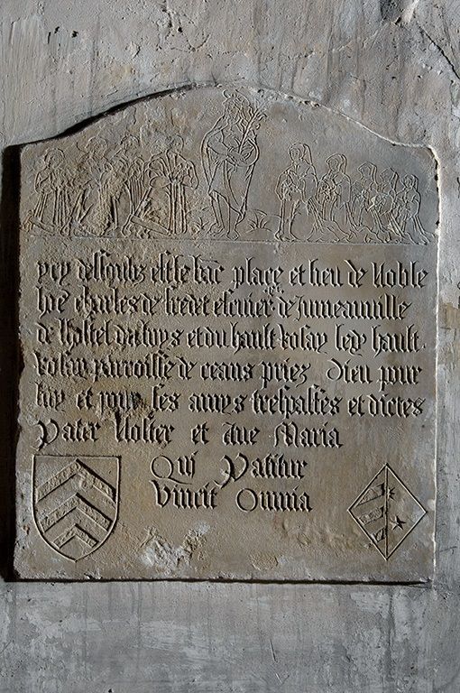 Cette plaque commémorative a été classée au titre des monuments historiques en 1961, comme monument funéraire. Cependant l’inscription ne signale pas la tombe du seigneur mais marque l’emplacement du banc qui lui est réservé, près du chœur, où elle a été retrouvée lorsqu’on a démonté la chaire à prêcher en 1875.