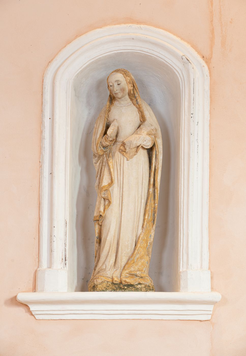 Une observation attentive de la statue, déposée à l’occasion des travaux dans l’édifice en 2012, a permis d’une part de vérifier le matériau (en pierre et non en bois), de remplacer son nom indéterminé de Sainte au livre par un thème iconographique (celui de la Vierge de l’Annonciation), ainsi que de situer sa création, à partir de quelques éléments stylistiques, non pas au XVIIe siècle, mais dans les années 1500.