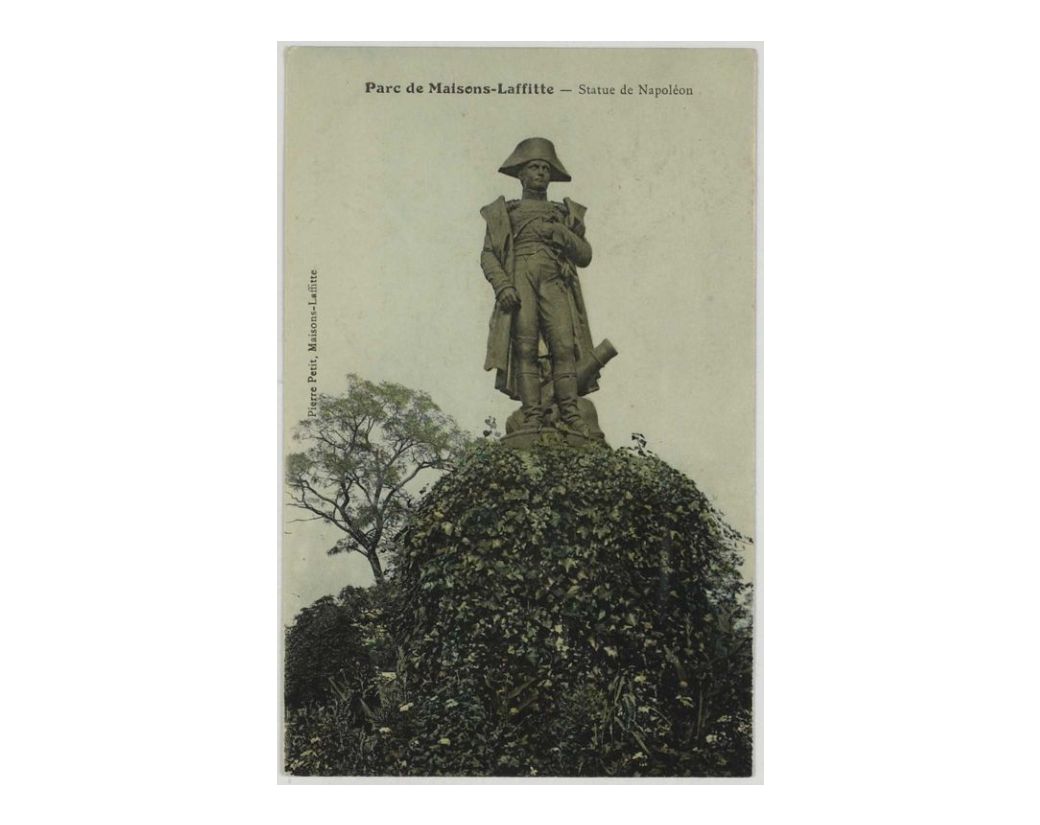 La sculpture est monumentale : elle mesure 2m45 de haut et pèse près de 500kg. L’artiste et la date exacte de réalisation en sont inconnus, mais l’œuvre est bien documentée par plusieurs photographies et cartes postales. Elle ressemble fortement à la statue de Napoléon de Charles Seurre, commandée en 1833 pour la colonne Vendôme et qui se trouve aujourd’hui devant l’Hôtel des Invalides (Paris). La statue de Maisons-Laffitte est en terre cuite et couverte d’une patine qui donne l’illusion du bronze.