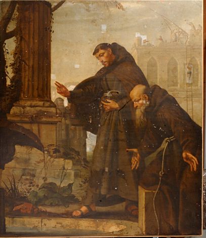 Cette œuvre de grande dimension figure un miracle difficilement identifiable, car rarement représenté, en présence de frères mendiants relevant de la famille franciscaine. Elle a été signalée dans l’église en 1905. Sa provenance reste inconnue mais elle a probablement été réalisée pour un monastère. Il y avait d’ailleurs un couvent de cordeliers à Pontoise, qui n’est pas très loin de Conflans-Sainte-Honorine. Perdue de vue, elle a été retrouvée dans l’église à la fin des années quatre-vingt et Inscrite au titre des Monument Historique en 1990.