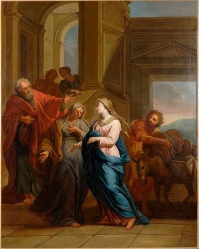 La scène représentée sur cette œuvre de grandes dimensions, la Visitation, est un épisode raconté dans l’Evangile selon Luc. Il évoque la visite que rend Marie alors enceinte, peu après l’Annonciation, à sa cousine Elisabeth. Cette dernière, plus âgée et elle-même enceinte du futur Jean-Baptiste, pressent l’état de Marie par une agitation intérieure et la reconnait comme mère de Dieu. La rencontre entre les deux femmes est souvent représentée comme un échange assez intime soulignant leur condition commune et leurs liens de parenté : unies par des gestes d’affection, elles occupent généralement le cœur d’une scène dont les hommes sont généralement écartés, voire absents.