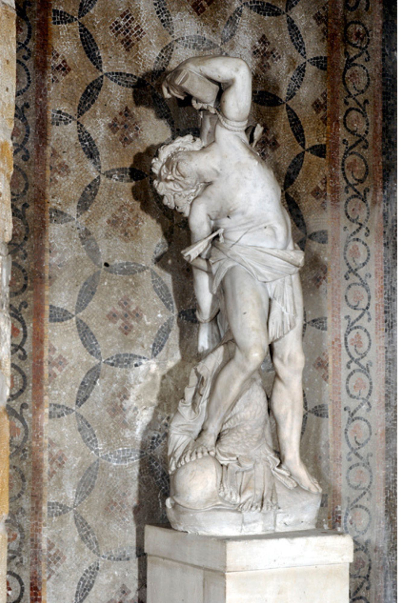En 1618, à Rome, le jeune Bernin achève sa formation auprès de son père. Il reçoit alors sa première commande personnelle : le cardinal Pietro Aldobrandini (1571-1621), neveu du pape Clément VIII, lui demande une sculpture, un saint Sébastien de marbre destiné à enrichir sa collection. L’œuvre est rapidement achevée et livrée et placée par son prestigieux commanditaire dans son palais de la via del Corso, aujourd’hui la galerie Doria Pamphili. Légué par le cardinal à sa sœur, Olimpia Aldobrandini (1623-1681), le Saint Sébastien reste dans la descendance de cette dernière et est transféré dans la villa Albobrandini di Monte Magnanopoli, près du palais du Quirinal. Elle y est mentionnée pour la dernière fois en 1710, lors de l’inventaire après décès de Giovanni Battista Pamphili (1648-1709), second fils d’Olimpia. On perd ensuite sa trace. En 1836, une statue de saint Sébastien est mentionnée dans l’église de Jouy-en-Josas. Le curé de la paroisse souhaite la vendre mais se heurte au refus de la commune. En 1906, le Saint Sébastien est inventorié et devient propriété communale. La sculpture, attribuée à Pierre Puget (1620-1694), est classée au titre des Monuments historiques dès 1907 mais l’attribution au Michel-Ange français est rapidement contestée.