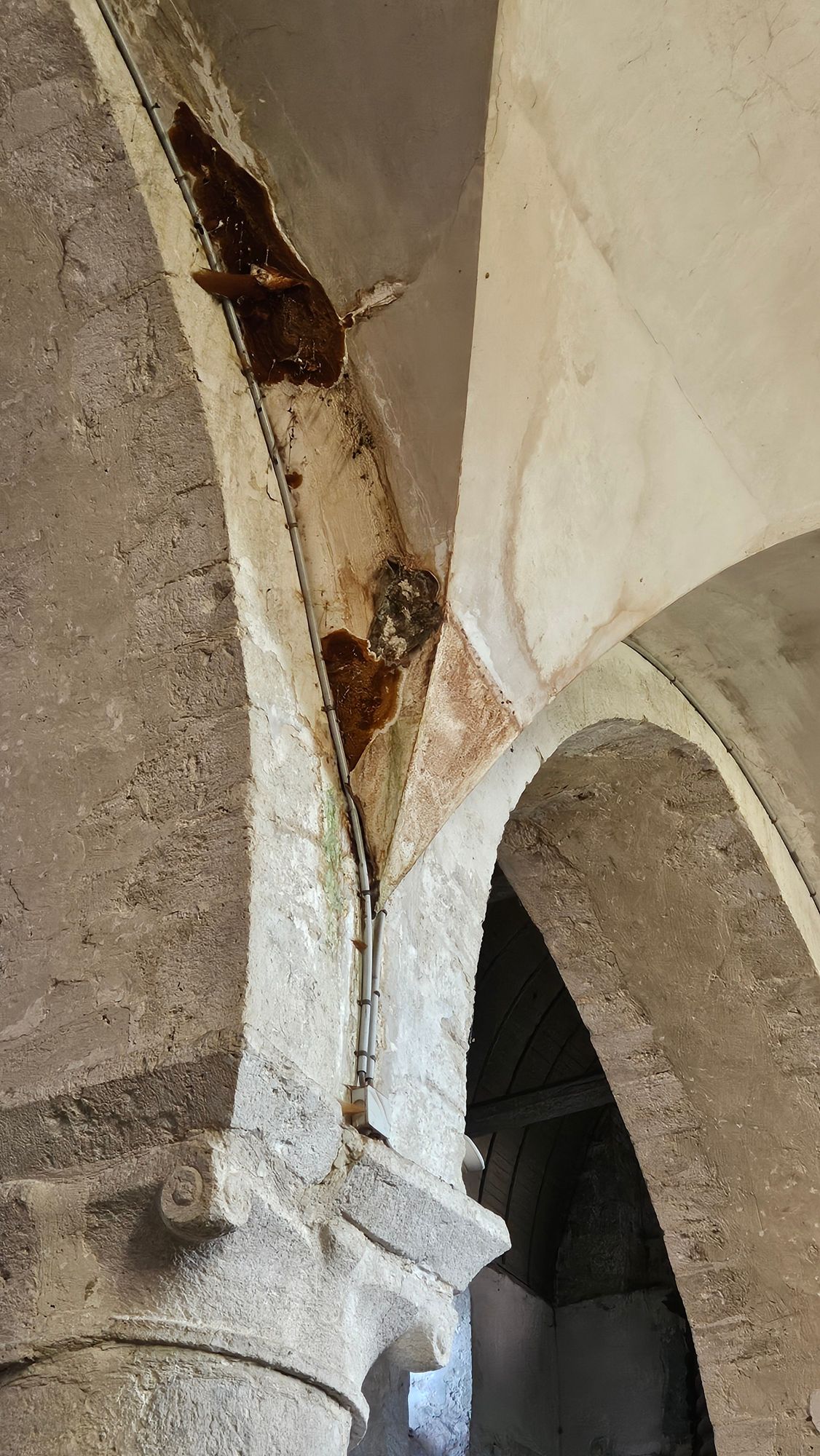 Cependant, en avril 2024, une menace bien plus grave a été détectée : des taches brunâtres apparaissaient sur les voûtes du bas-côté nord, indice d’une infestation par la mérule. Après une expertise menée par Mme Laurent, experte mycologue, la présence du champignon a été confirmée.