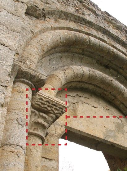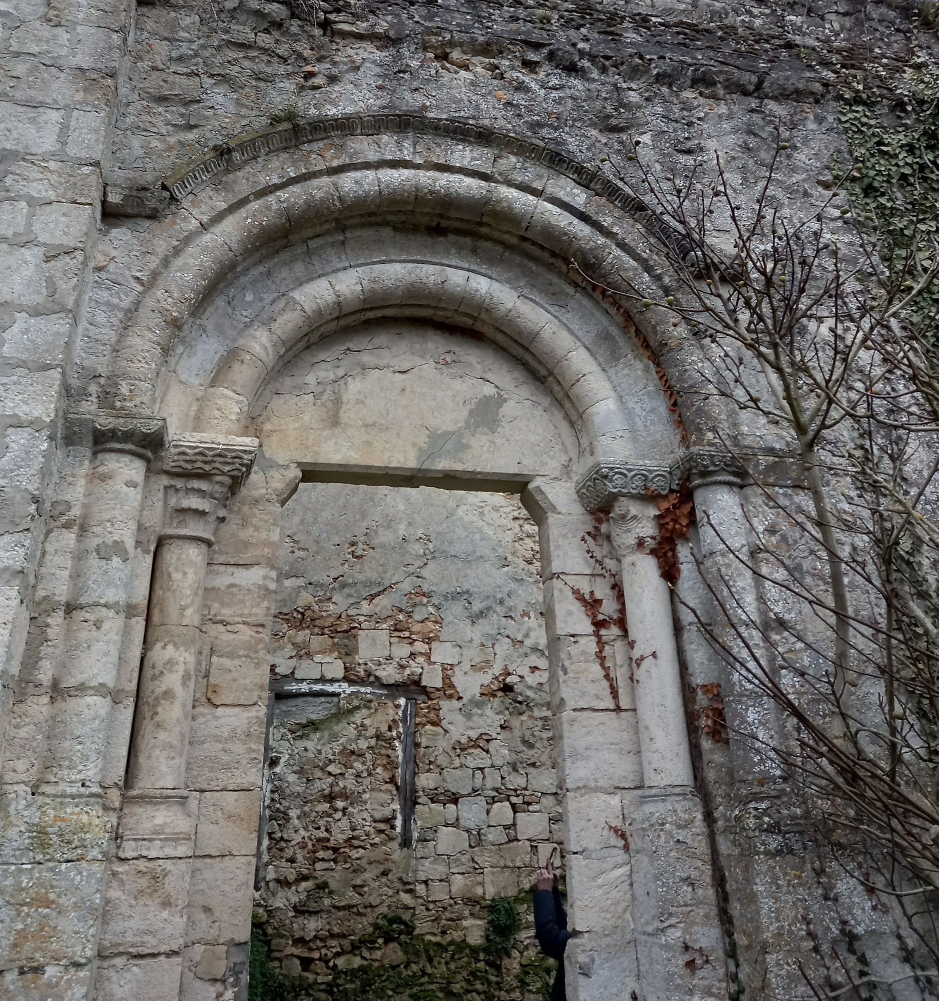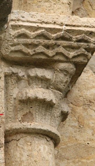 Il ne reste aujourd'hui que peu d’éléments de l’édifice initial, mais l’on peut encore apercevoir une porte romane, située dans le transept sud - aujourd'hui en ruines, qui assurait probablement le passage vers le cloître. Orné de deux rouleaux reposant sur deux colonnettes, ce portail est surmonté par une archivolte à bandeau et cavet[1] décoré d’oves. On y remarque aussi des chapiteaux aux décors végétaux et géométriques, ainsi que des représentations anthropomorphiques.