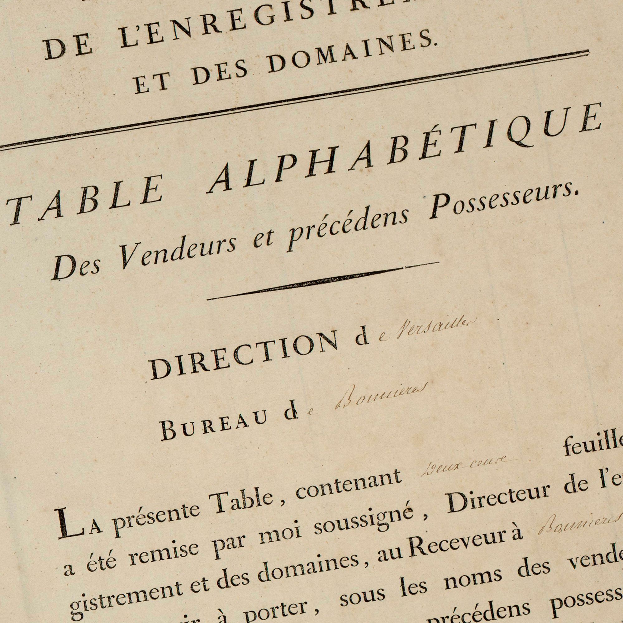 Après la Révolution française, les bureaux de contrôle des actes sont remplacés par les bureaux d'Enregistrement. A partir de 1866 et jusqu’en 1970, ces bureaux d’Enregistrement sont en charge de la rédaction d'un répertoire général. Ce dernier est composé de deux ensembles : le répertoire des droits celés et le fichier général.