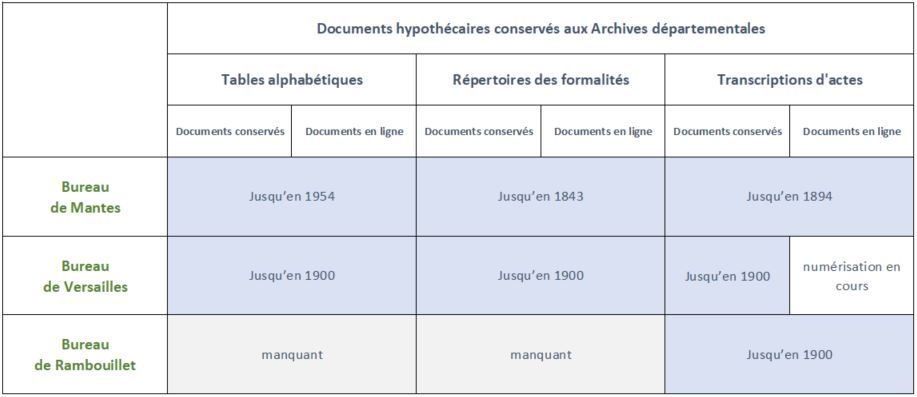 Les Archives départementales des Yvelines ne conservent plus que trois bureaux des hypothèques de l’ancien département de Seine-et-Oise et ce, jusqu’en 1900 uniquement.