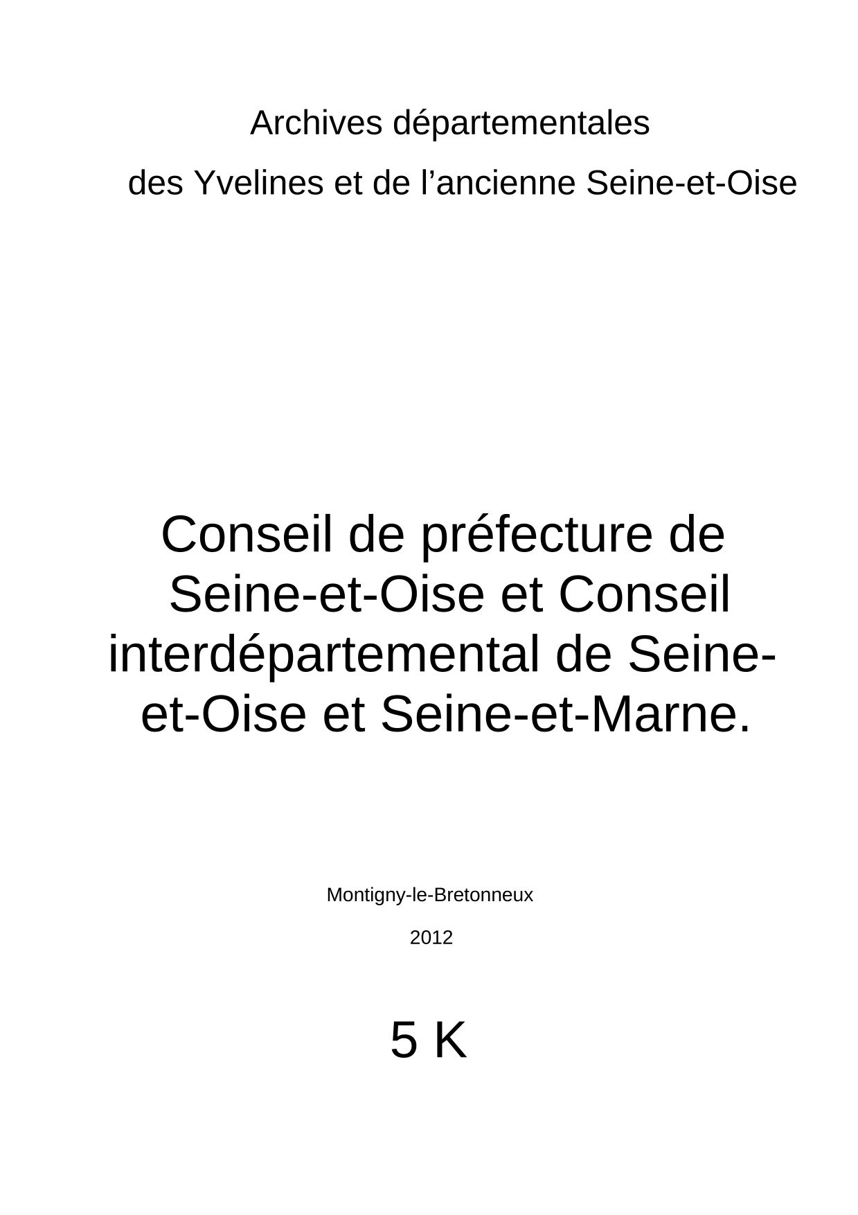 La série K des Archives départementales des Yvelines comporte 5 sous-parties. Les premières sous-séries sont consacrées aux actes émanant du pouvoir central (1K Bulletin des lois, 2K Journeaux officiels). Les sous-séries suivantes regroupent les actes de la préfecture de Seine-et-Oise (3K Recueil des actes administratifs, 4K Arrêtés du préfet de Seine-et-Oise). La dernière sous-série (5K Conseil de préfecture) comporte les arrêtés de cette justice administrative, un temps commune avec la Seine-et-Marne (conseil interdépartemental de Seine-et-Oise et de Seine-et-Marne).
