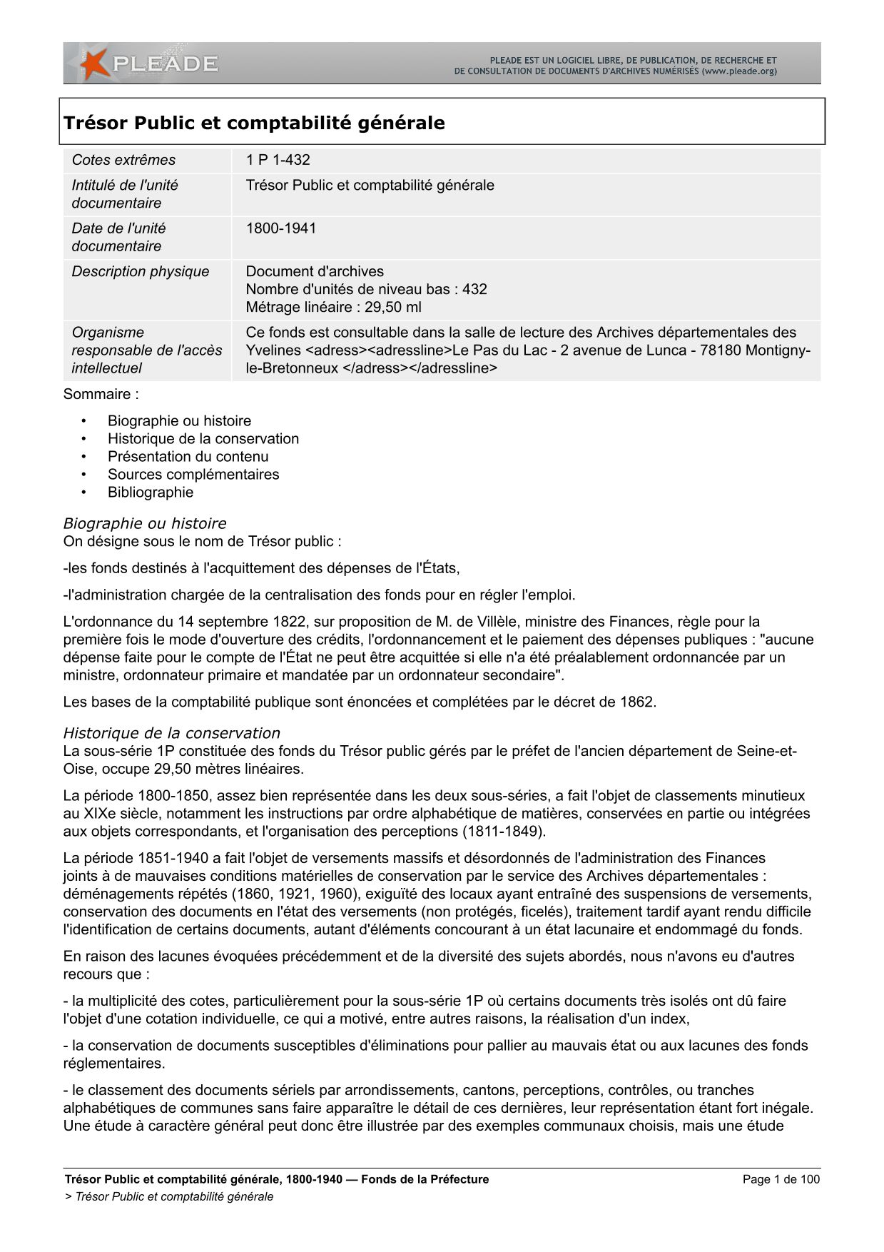 - 1P : Trésor public et comptabilité générale (fonds de la Préfecture de Seine-et-Oise)