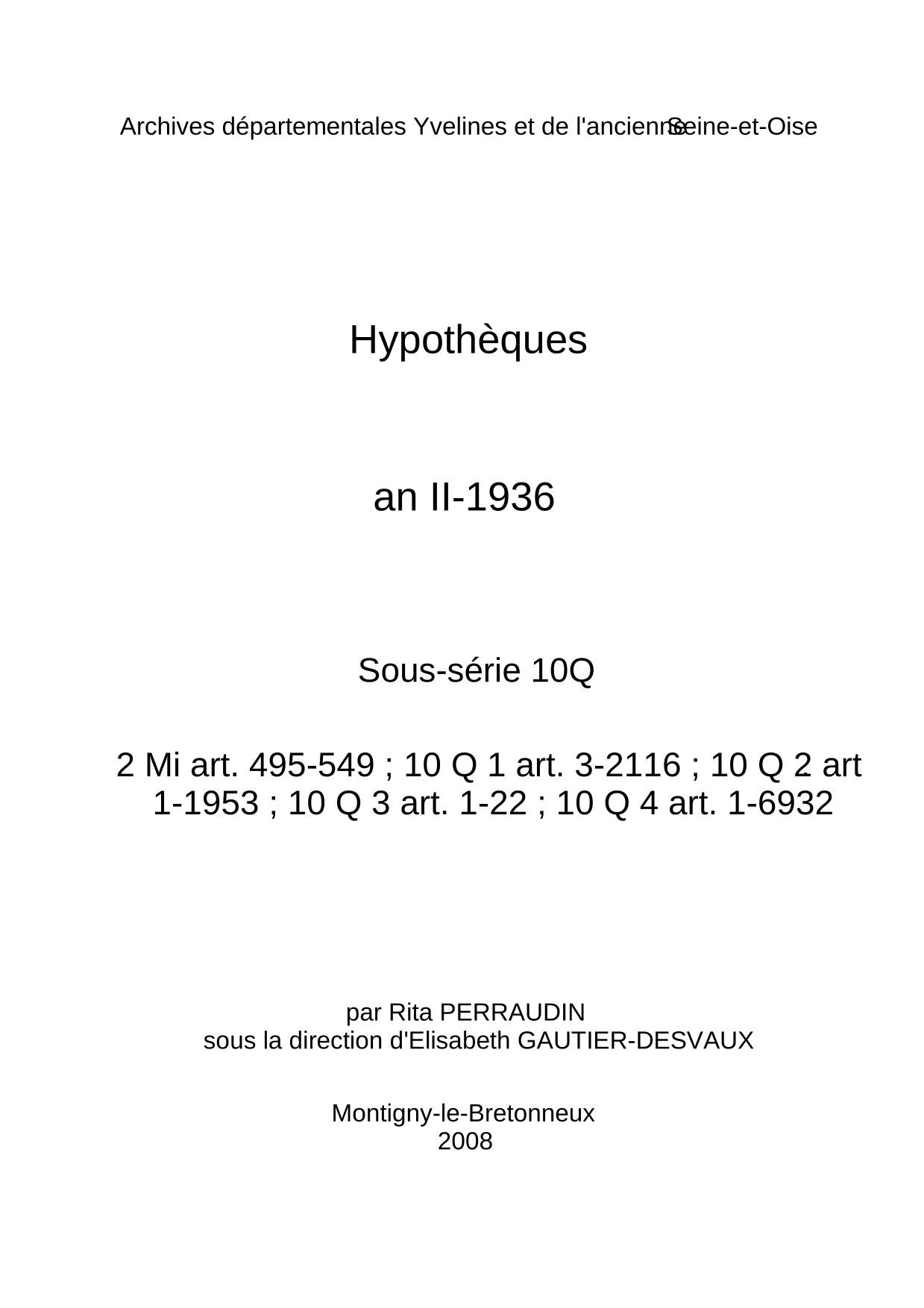 Les Archives départementales des Yvelines proposent deux types d'accès à l'instrument de recherche de la sous-série 10Q (jusqu'en 1900) :