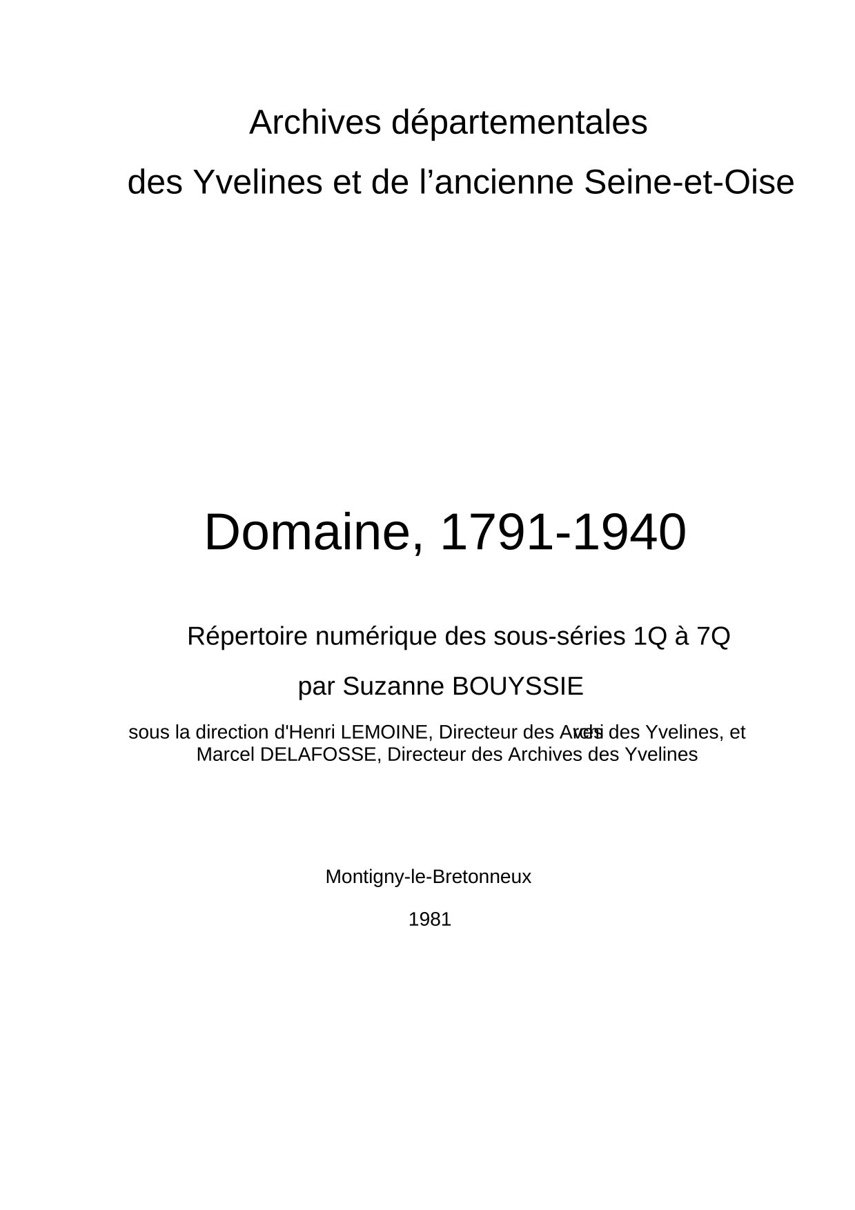 Dans les Yvelines et l'ancien département de Seine-et-Oise, les papiers provenant de l'activité des diverses administrations chargées de gérer les domaines nationaux au cours des XIXe et XXe siècles ont été répartis entre les sous-séries 1Q à 4Q