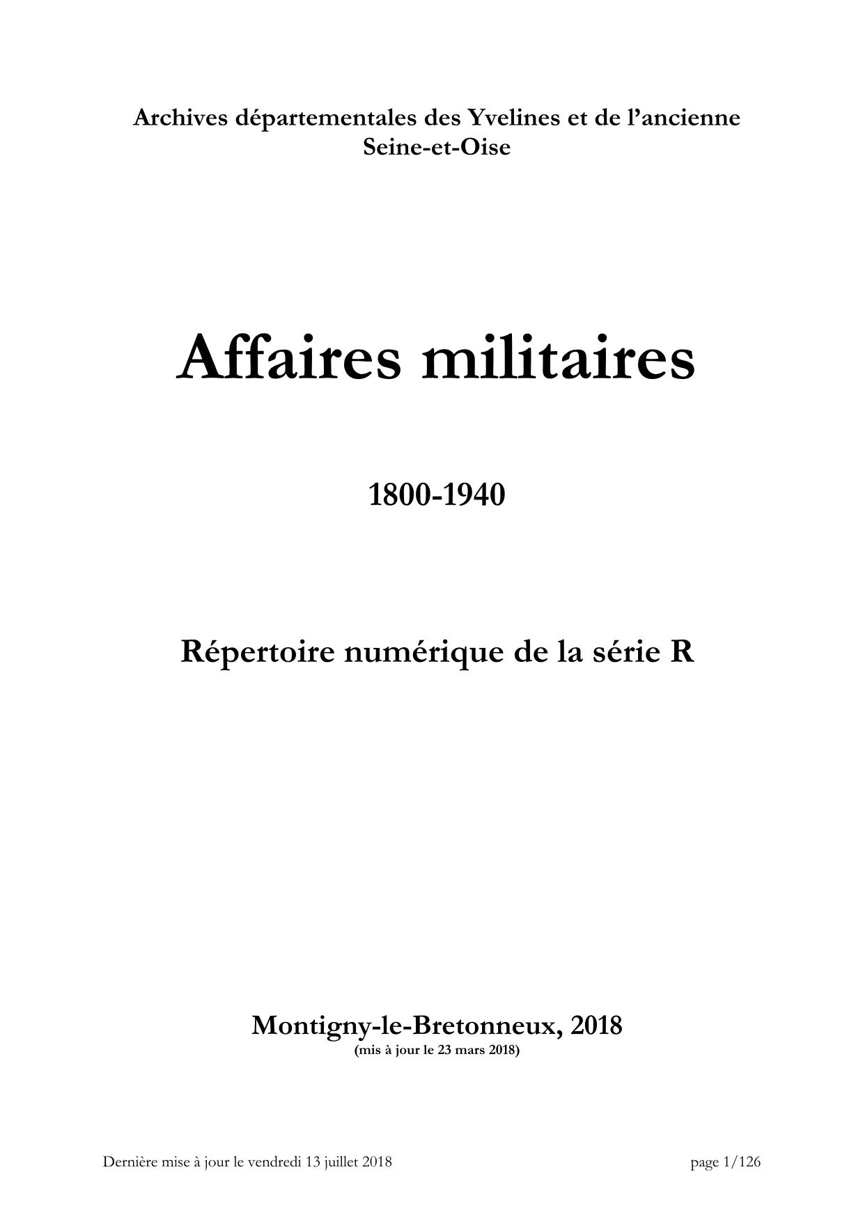 La série R n'est pas constituée de documents d'origine militaire, exceptés les registres matricules (1867-1940), versés aux Archives départementales par le Bureau central des archives militaires administratives du ministère de la Défense. Les documents relatifs à l'histoire des opérations militaires ou des corps d'armées sont conservés au château de Vincennes par le Service historique de la Défense.