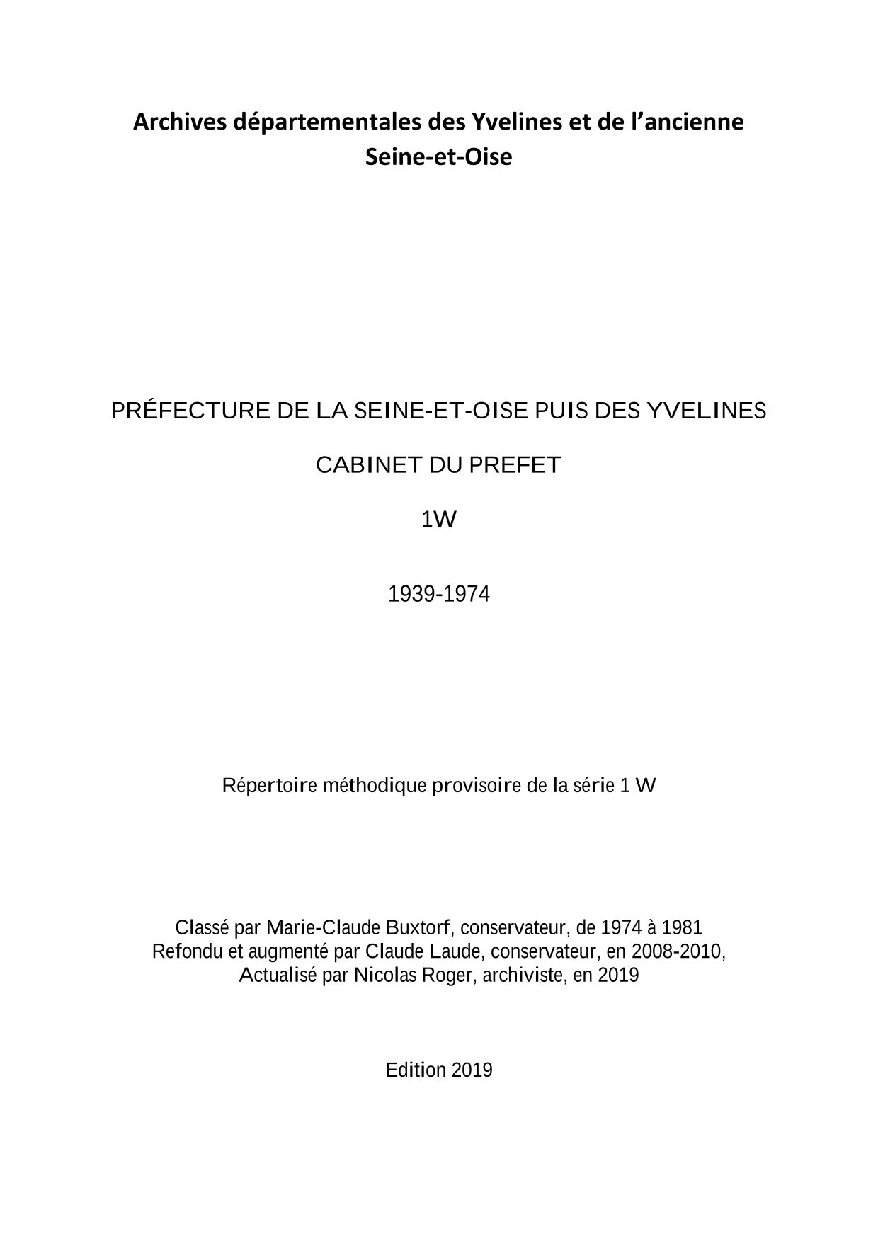 1W - Cet ensemble de documents ne correspond pas à un versement mais, sur le principe antérieur du classement par séries, à une suite de la série M, organisant méthodiquement le contenu de plusieurs versements des services de la Préfecture de Seine-et-Oise, dont le Cabinet et la Direction de la police générale, portant globalement sur la période 1930-1974. Les documents conservés traitent de l'Etat français, de juillet 1940 à août 1944, puis de la République française de septembre 1944 à 1974. Pour la période 1944-1974, les fonds de la Préfecture ont été complétés par des versements ultérieurs concernant les élections (1944-1965), la Sûreté générale (1934-1964), la police administrative (1940-1974), les divisions administratives (1942-1964), le ravitaillement (1938-1959), le commerce et le tourisme (1930-1968), l'industrie (1940-1966) et le travail (1940-1964).
