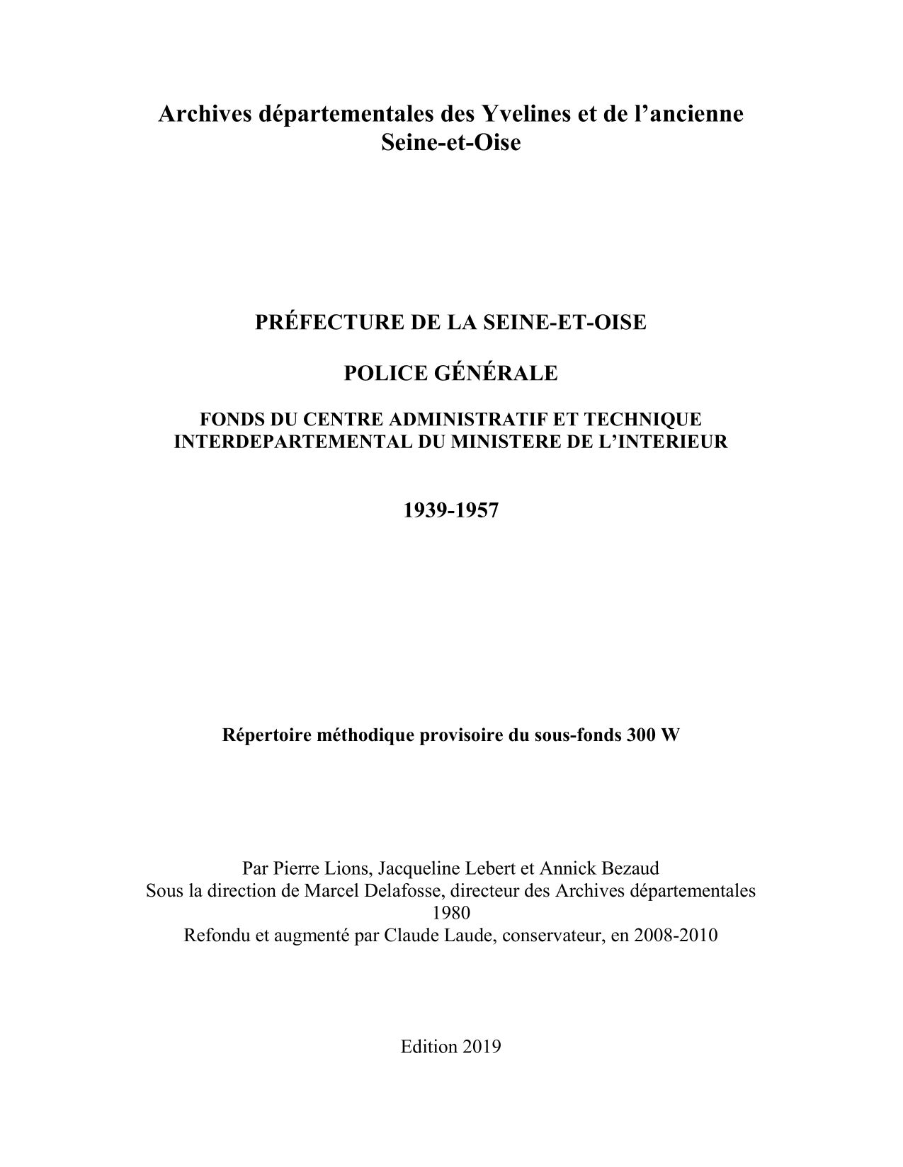 300W - Les archives de certains services de la préfecture de Seine-Oise, et en particulier celles des services en charge de la police, ont été conservées par le Centre administratif et technique interdépartemental de Versailles (CATI). Ces documents concernent majoritairement la période 1939-1945, mais pour certaines parties vont jusqu’en 1958. Ces documents concernent essentiellement la police : organisation et personnel de la police d’État, enquêtes, correspondance et rapports journaliers concernant répression des activités clandestines (terrorisme et communisme), déportés, internés, prisonniers de guerre. Ils traitent également du ravitaillement, de la santé et du travail. Ce versement contient en particulier le fichier du STO (service du travail obligatoire) qui est le seul reste des archives de ce service détruites par un incendie en mai 1944.